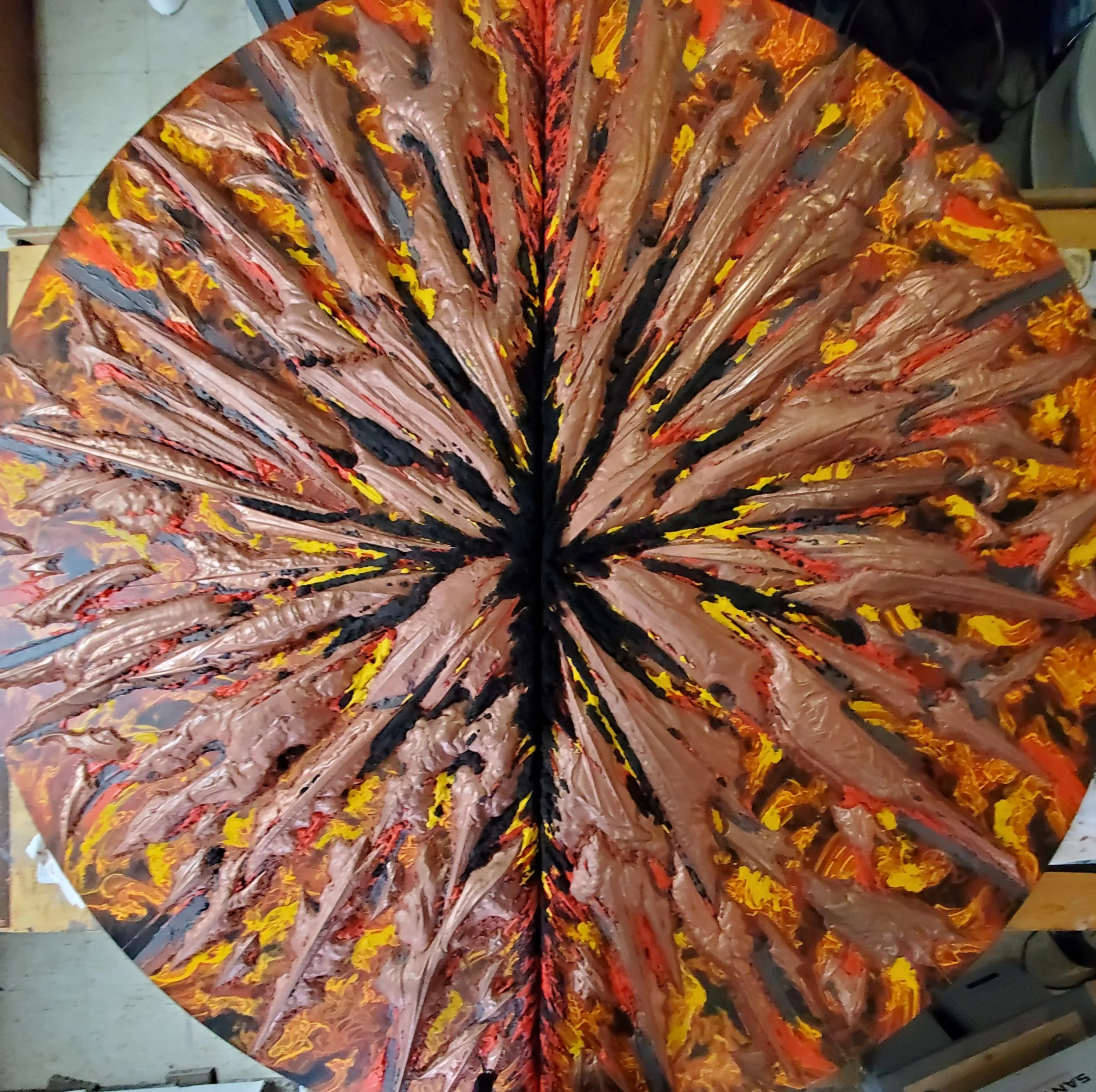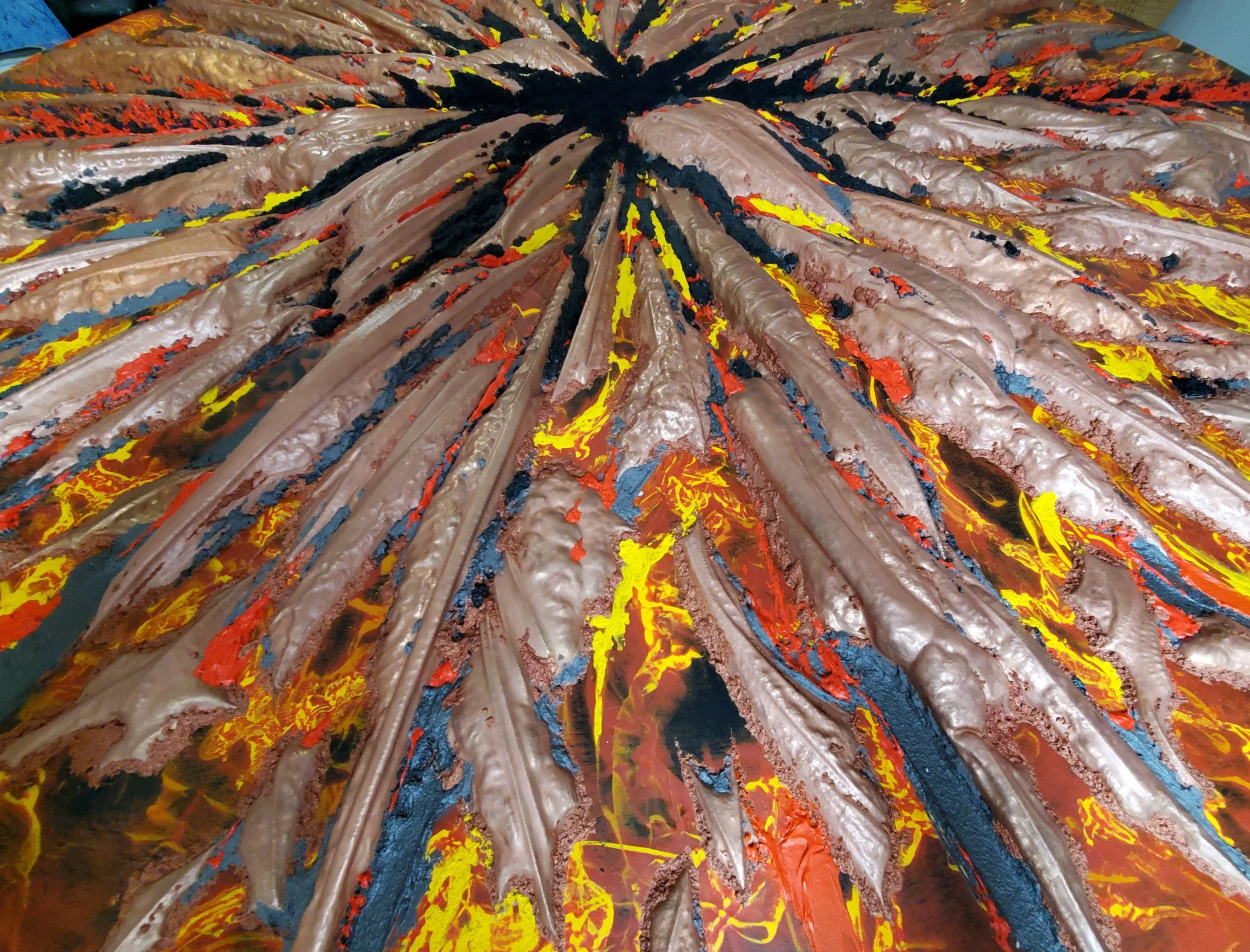 At 5 feet diameter, first of the two major anchor works planned for the series, AM 5 speaks to the growing phenomena of flood induced landslide, typified by, but not limited to, glacial lake outburst flooding (GLOF). Diluvium, is the first anchor work, and will directly face Ardens Mundi 10, Ruptura, the climactic work, of the Ardens Mundi cycle. The foundational substrate shown here with palladium leaf bevels.