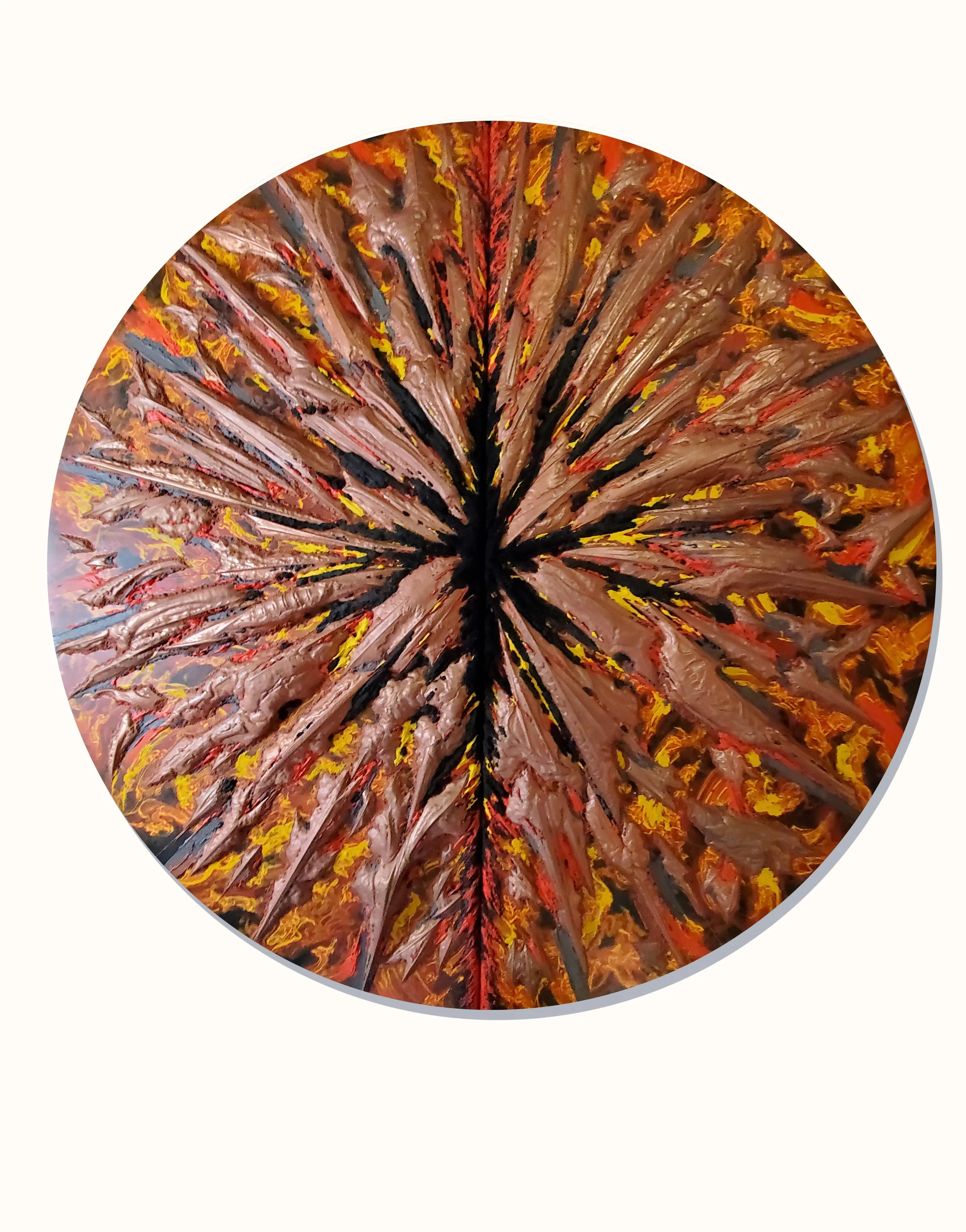 Ardens Mundi 1, Inferno 2017 Copper repoussé elements, mineral particle threads, and abraded acrylic on 1.5 inch archival wood panel, 48 inch diameter.